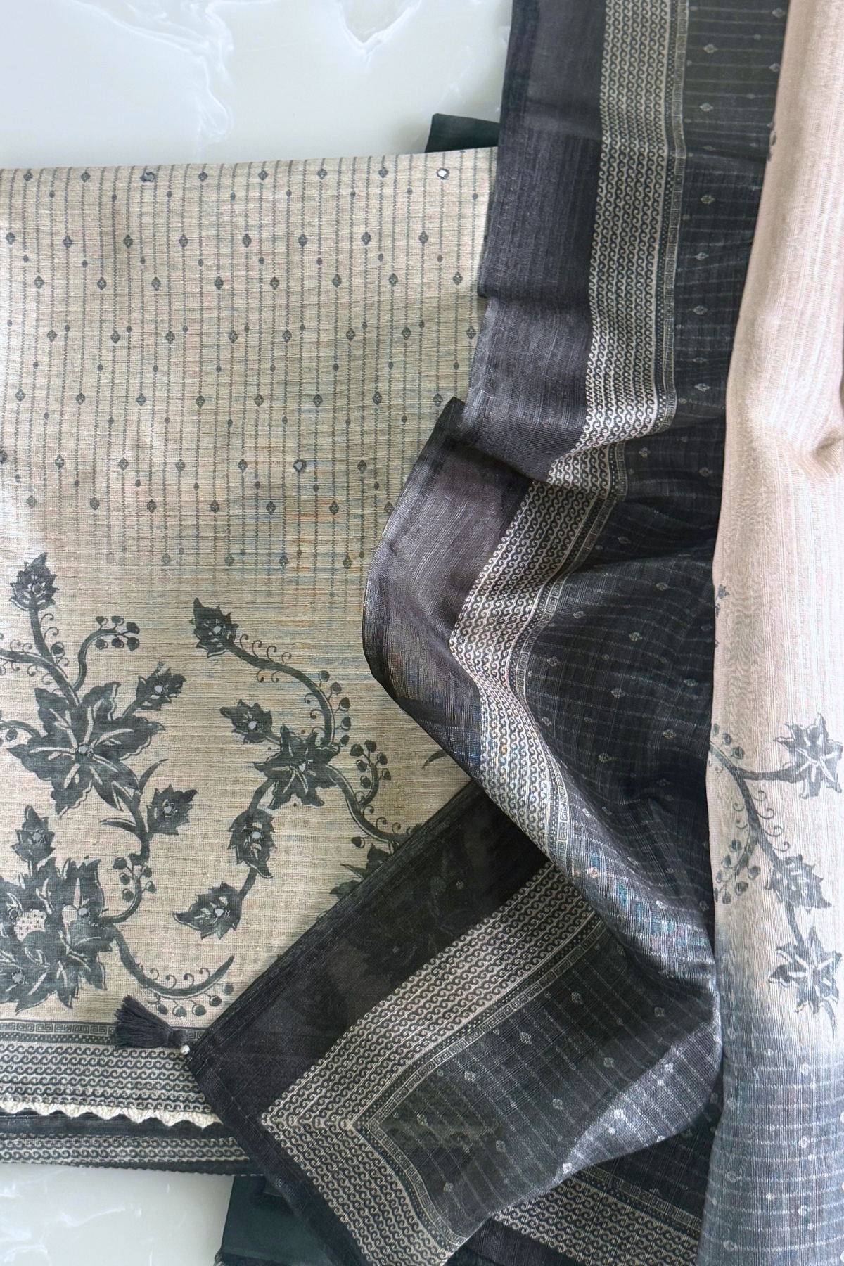 Earthy tones meet artisan detailing in the Beige & Green Suit Set. Crafted in soft linen with a muted floral print, this elegant ensemble features scattered mirror motifs and decorative border accents along the kurta and dupatta. The rich green and beige palette offers timeless charm, perfect for semi-formal wear or serene daytime gatherings.