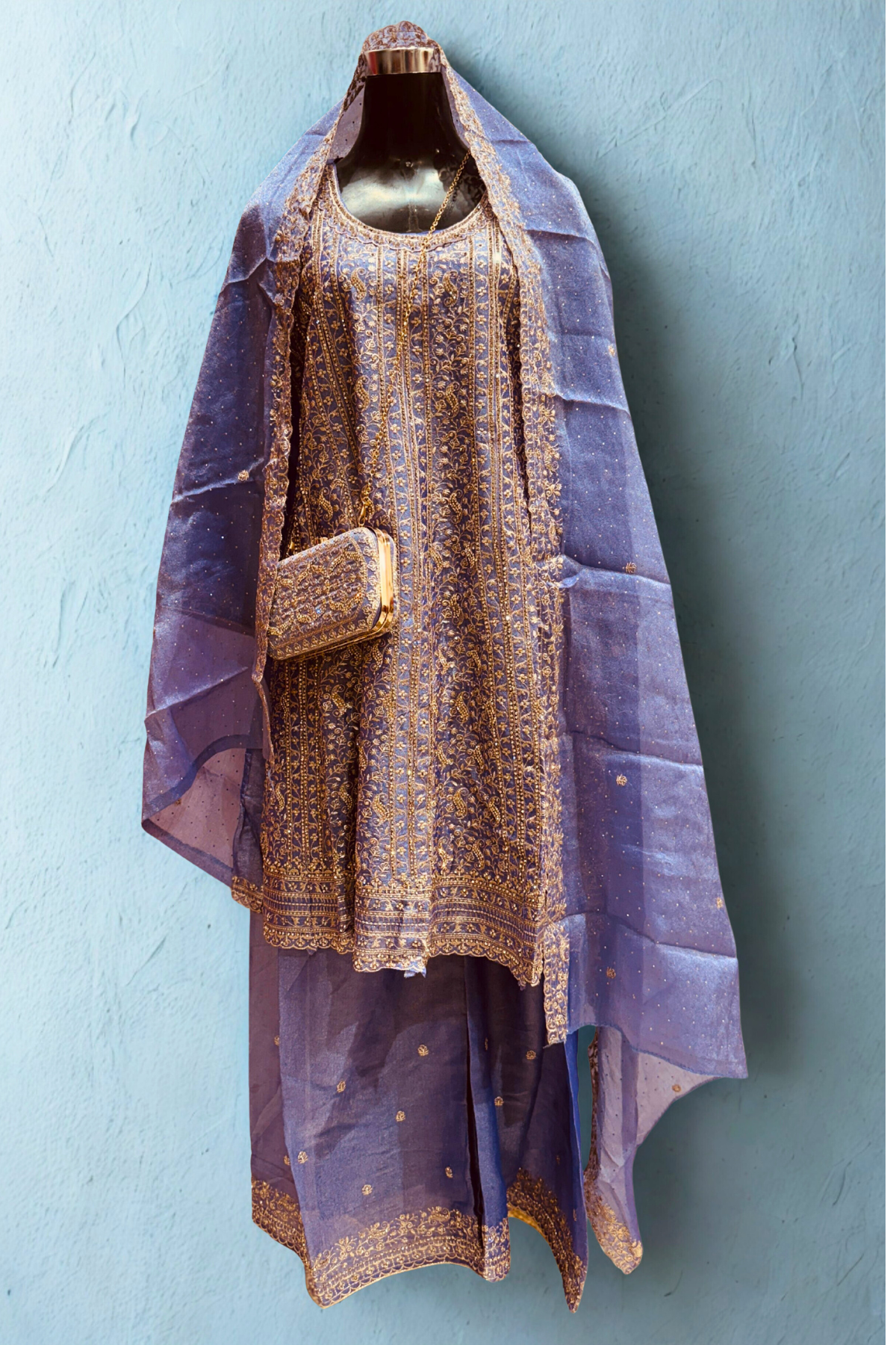 Stunning Purple Organza ensemble with Rich Golden Embroidery, Intricate Threadwork Patterns, and Scalloped Hemline paired with matching sharara pants.