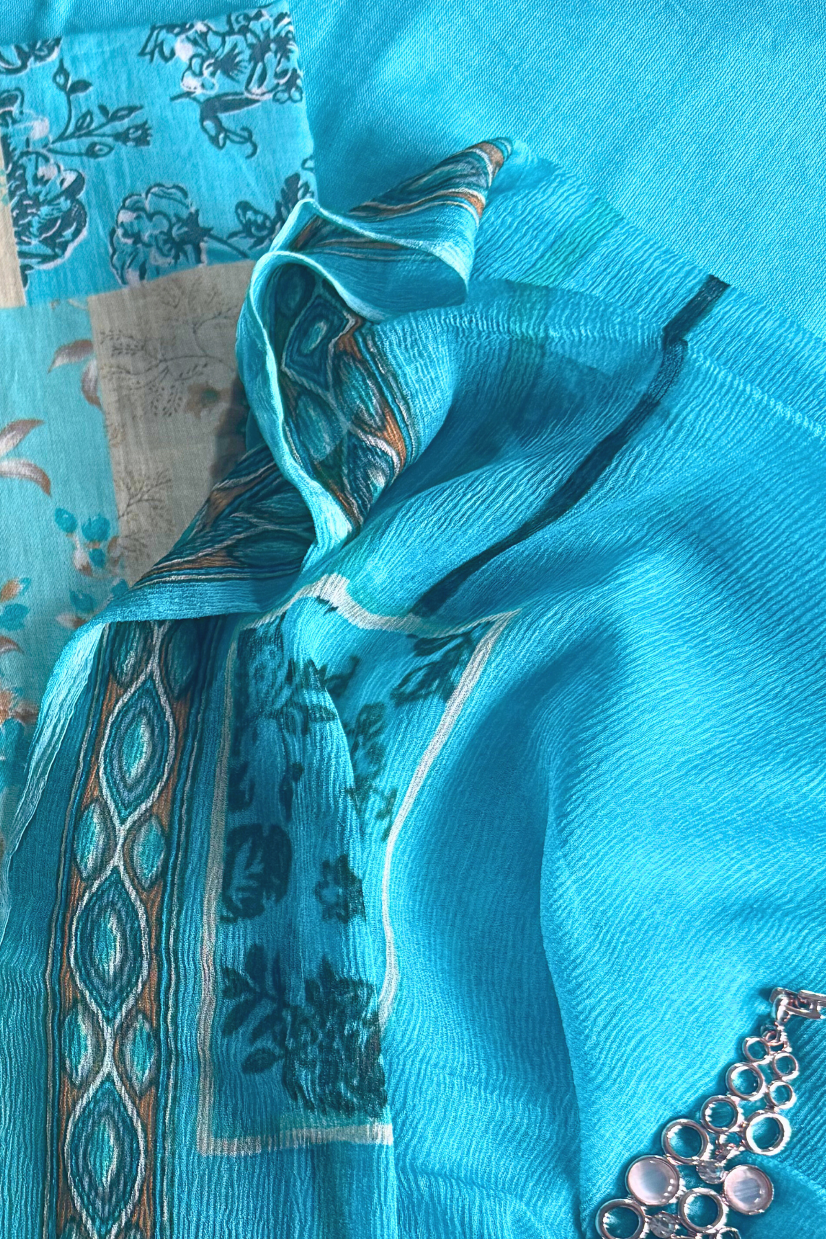 Playful and pretty, the Blue Patchwork Suit Set features a uniquely designed kurta with bold patchwork prints, an embroidered floral motif, and decorative borders that add charm to this everyday ethnic wear. Paired with a contrasting cream bottom and a light chiffon dupatta, this cotton set is breathable, stylish, and perfect for casual wear.
