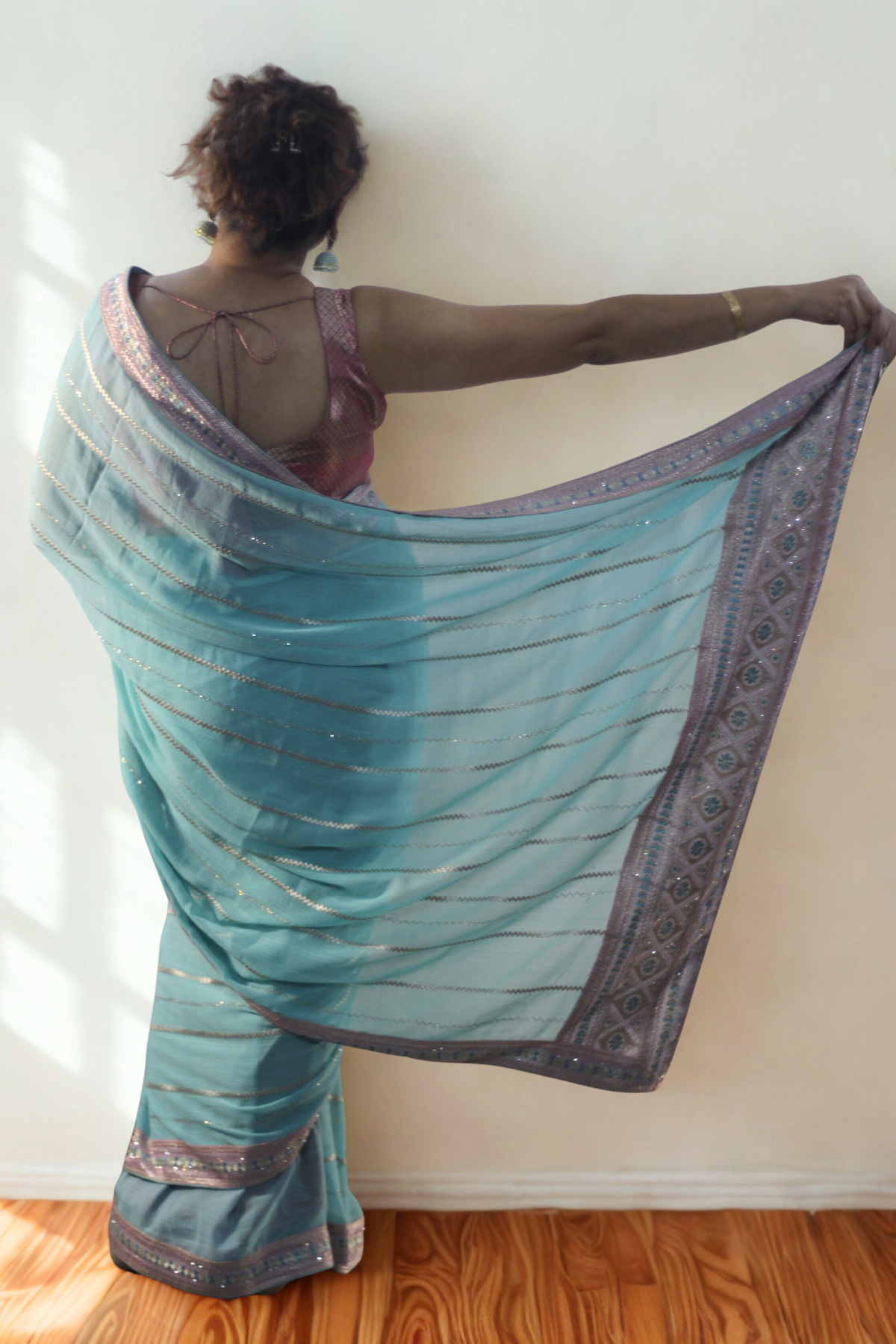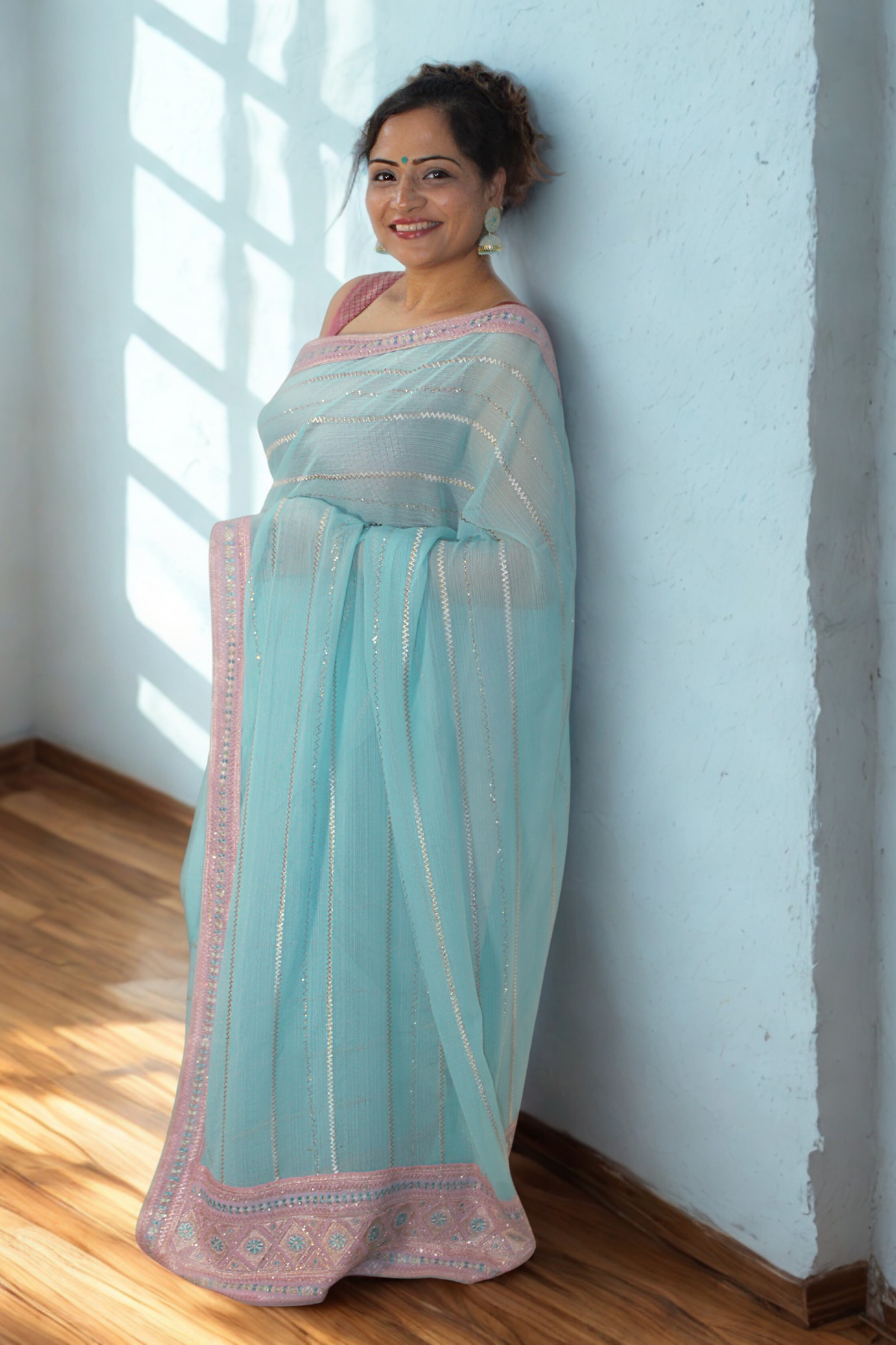 Effortlessly elegant, the Blue Zari Georgette Saree features a soft sky blue georgette base adorned with intricate gold zari embroidery and geometric patterned borders. Subtle rhinestone embellishments throughout the saree add just the right hint of sparkle, making it a perfect pick for daytime celebrations or evening soirees.