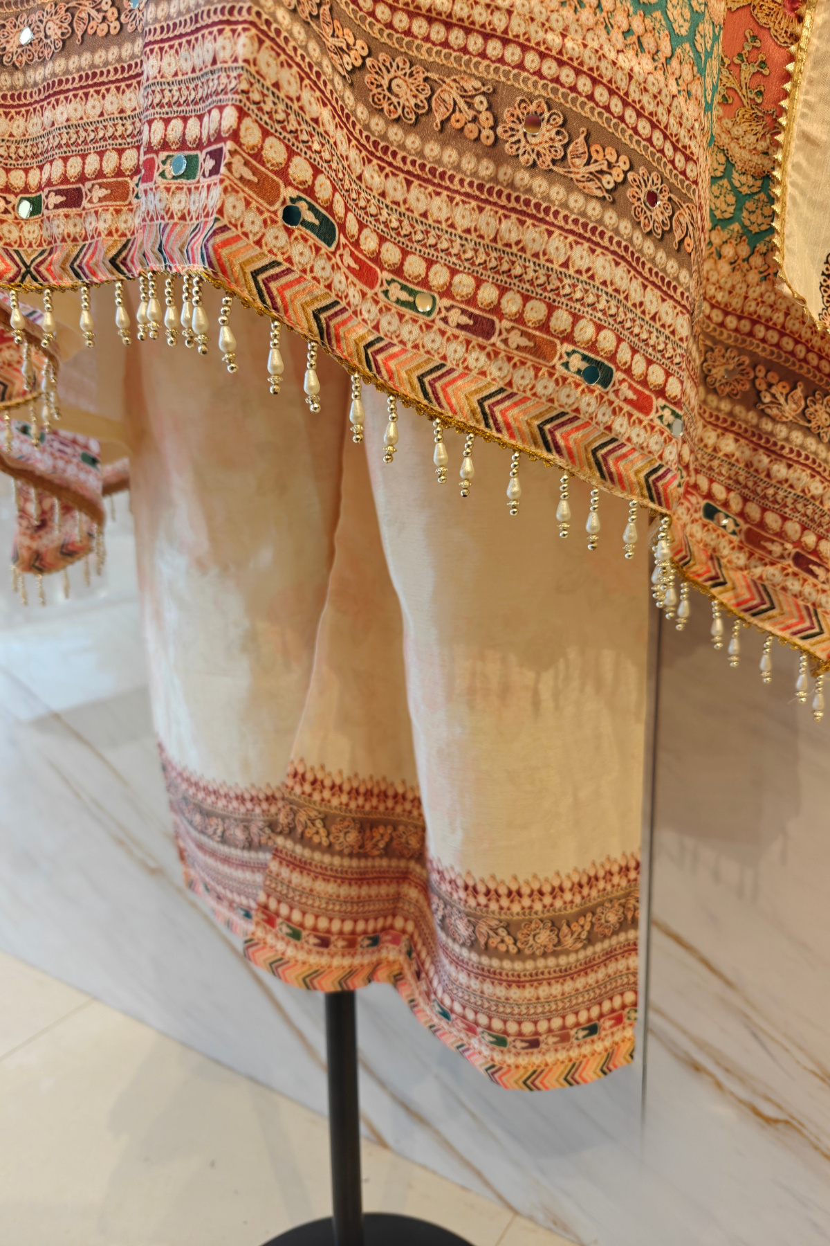 Elegant Cream ensemble with Vibrant Floral Digital Prints, Ornate Geometric Borders, Embellished Neckline with Mirror work, and matching palazzo pants with Tassel Detailing.