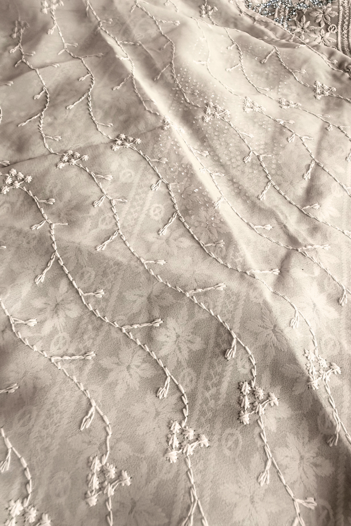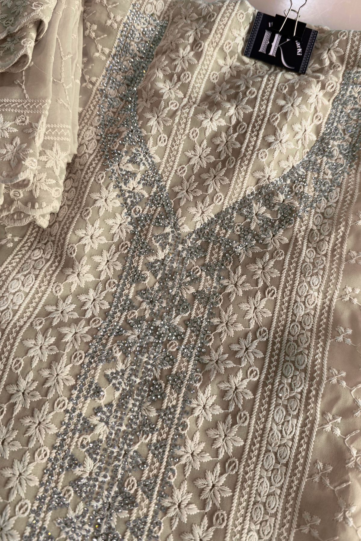 Elegant Greyish Brown Georgette Kurta featuring Intricate Embroidery and Sparkling Rhinestone work, paired with a matching embroidered dupatta and plain bottom