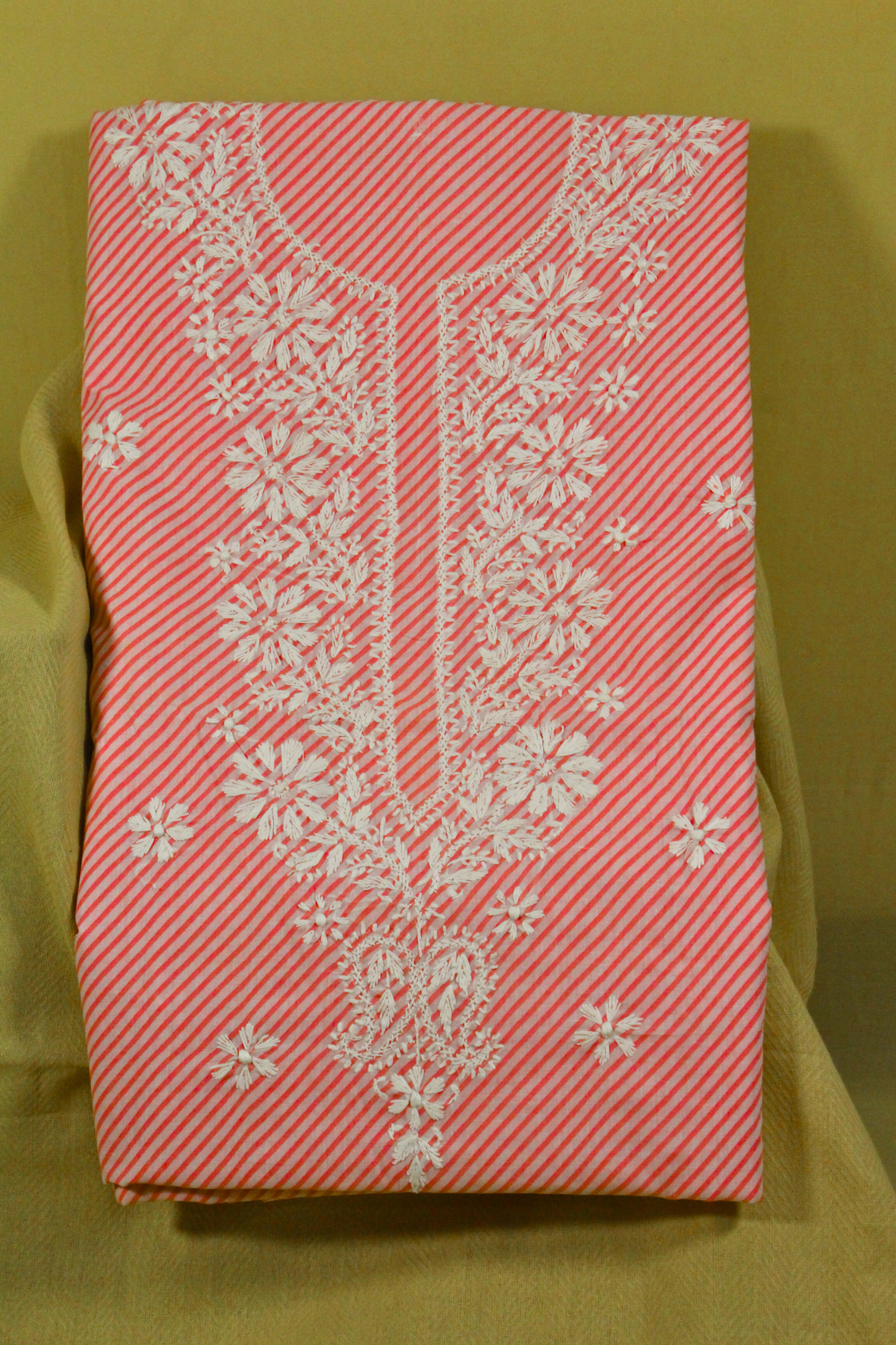 Chikankari Floral Embroidery on traditional Lehariya Pattern, with Chiffon Dupattta