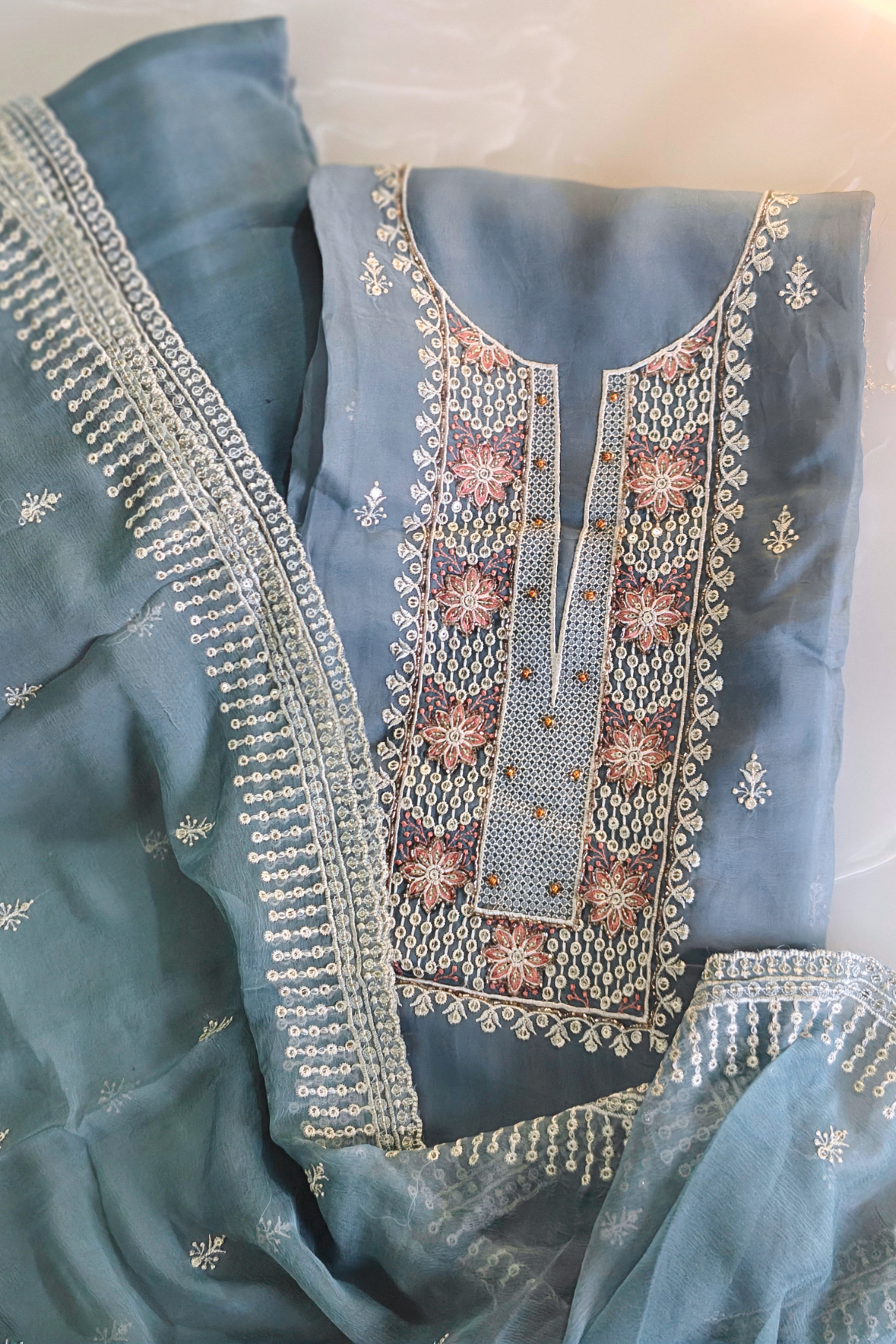 Ethereal and elegant, the Greyish Blue Organza Suit Set is a delicate blend of soft structure and traditional craft. Featuring fine thread embroidery along the neckline and hem, and a beautifully tailored organza base with lace trimming, this set is perfect for serene daytime occasions or understated festive wear.
