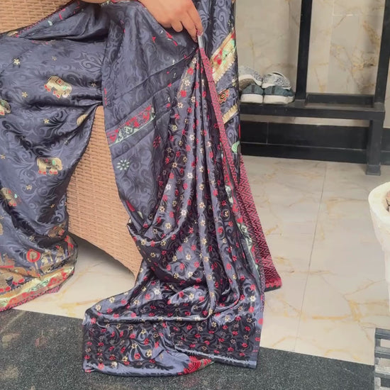 Opulent Black Bamboo Silk Saree featuring Majestic Elephant and Barat Procession Motifs with Intricate Golden Borders and Floral Accents.