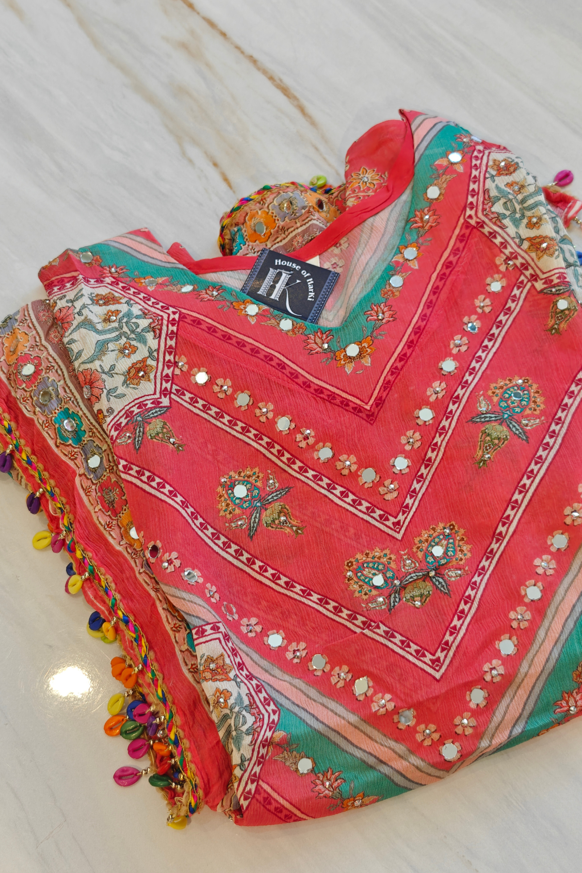 Vibrant Coral Kaftan with Intricate Paisley Print, Mirror Work, Colorful Seashells, Paired with Matching Cotton Pants and Inner Slip For comfortable elegant wear.