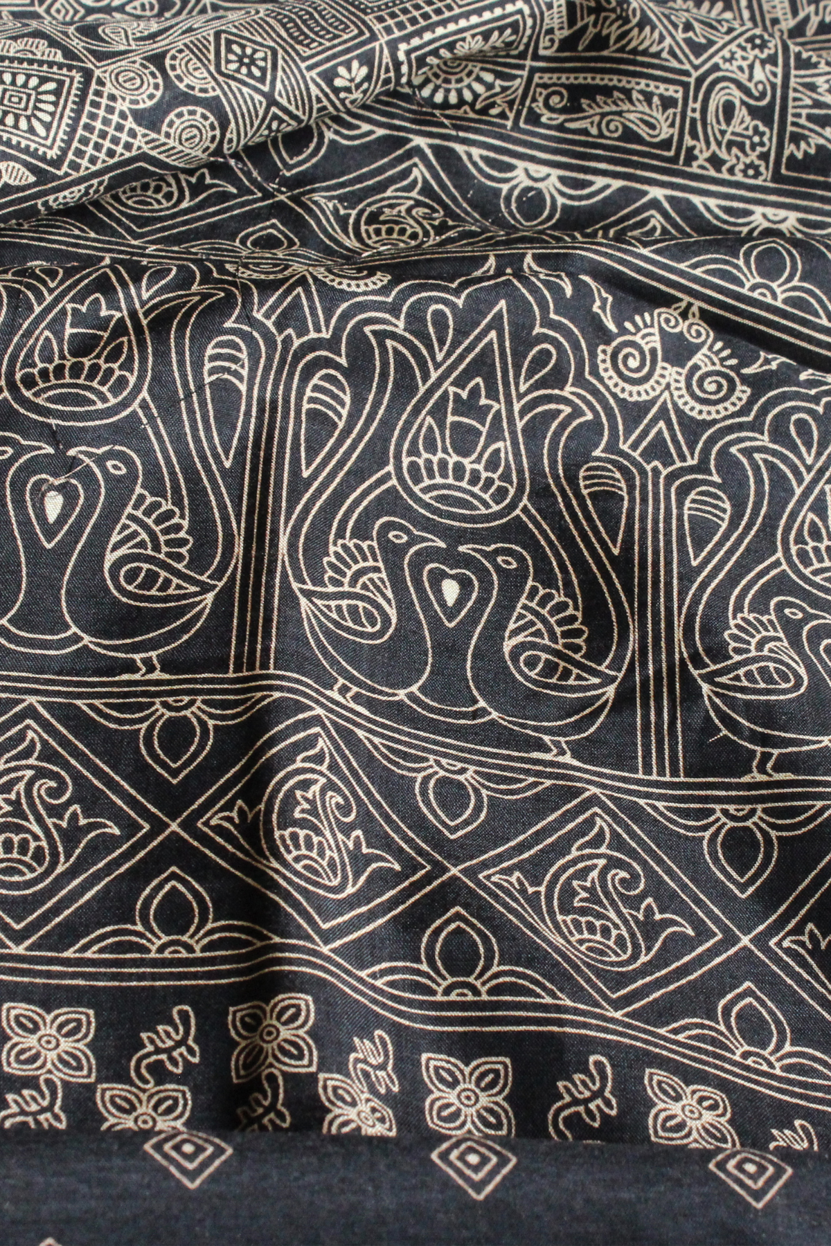 Traditional Warli-Inspired Geometric Print Modal Saree with Intricate Tribal Motifs and Elegant Golden Woven border.