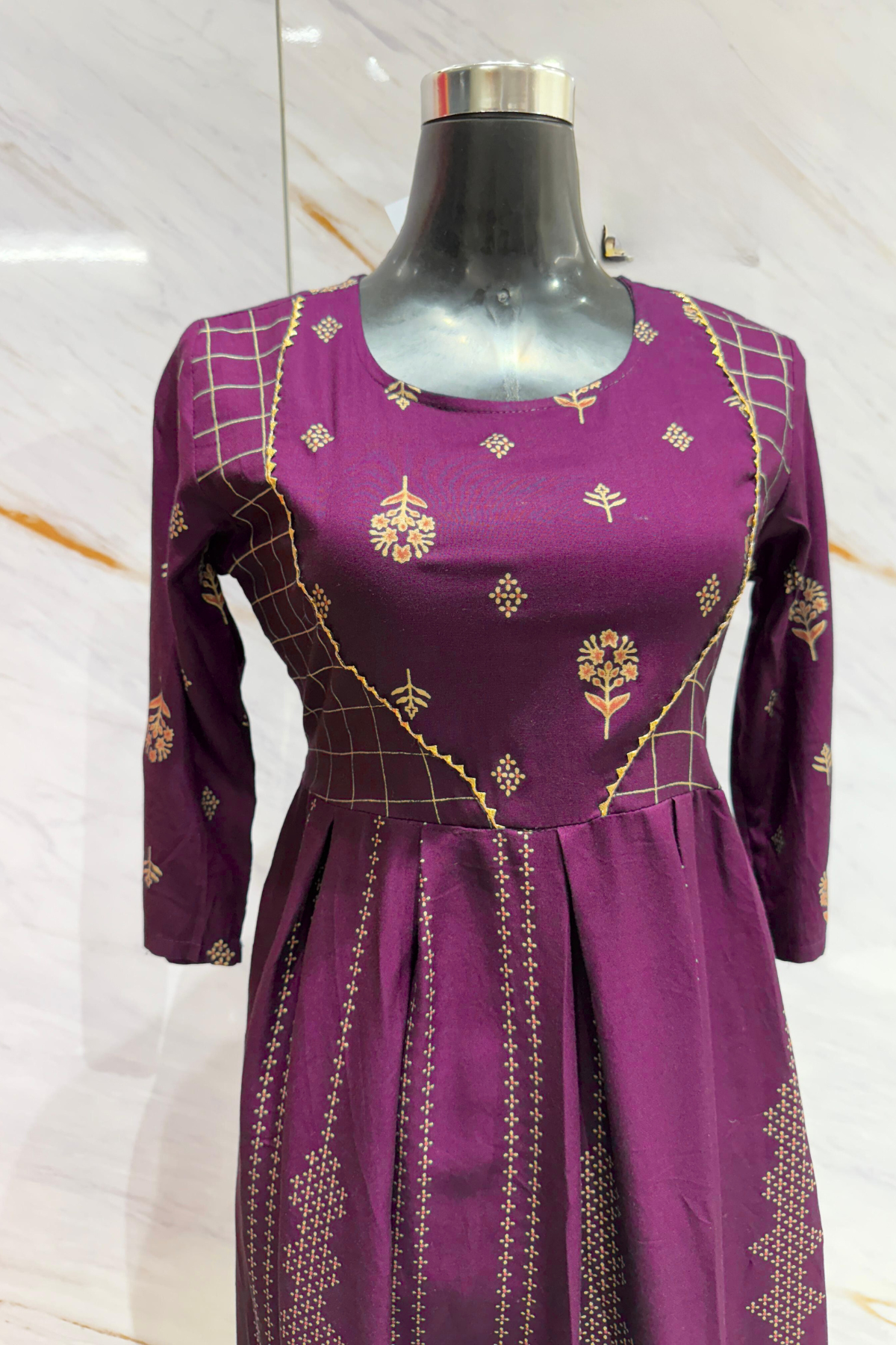 Rich Navy Blue Cotton Kurti featuring Golden Floral Motifs, and Colorful Vertical Embroidery Stripes in an elegant Empire-Waist Silhouette with full-length design.