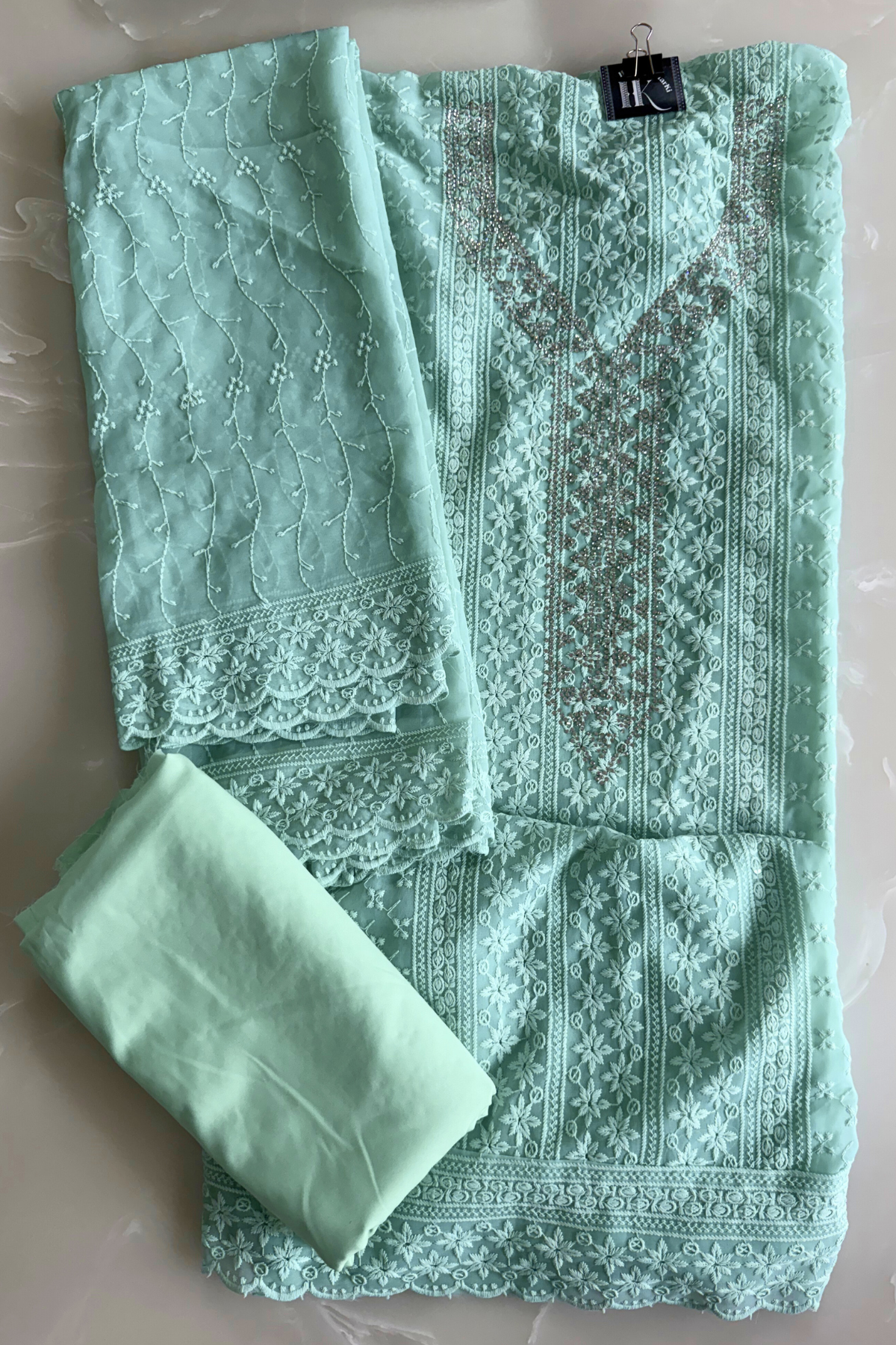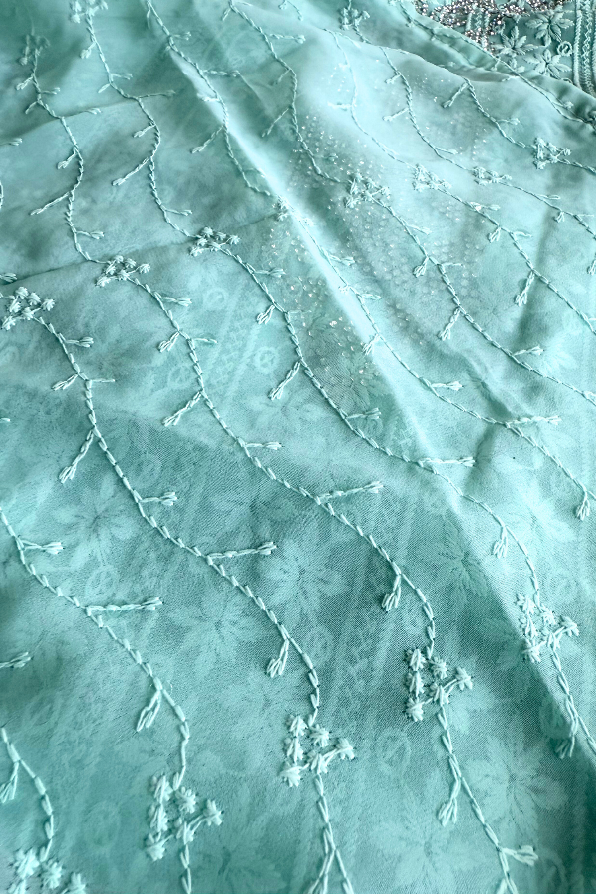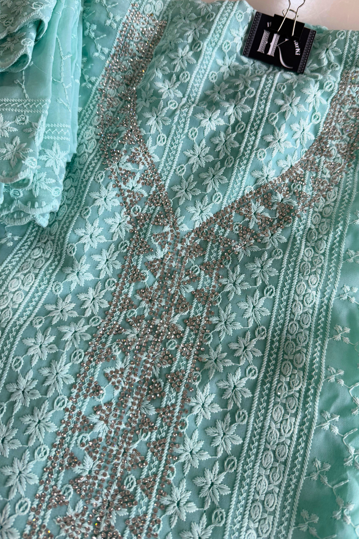 Elegant Mint Green Georgette Kurta featuring Intricate Embroidery and Sparkling Rhinestone work, paired with a matching embroidered dupatta and plain bottom
