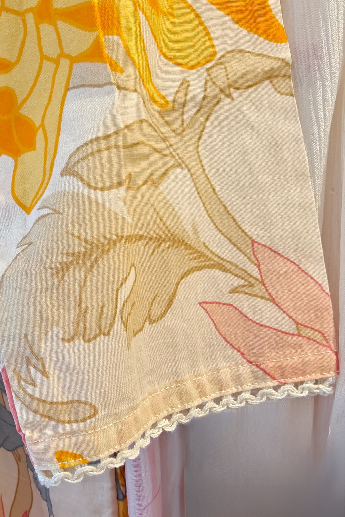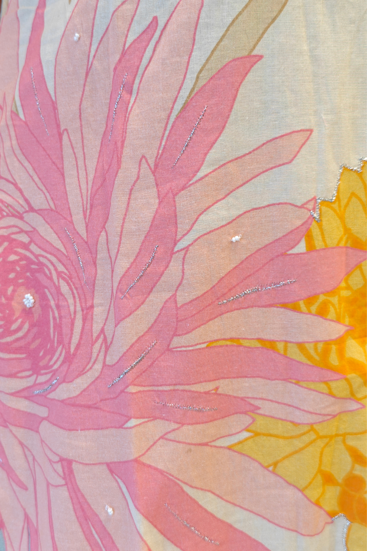 Premium Cotton Kurta with Vibrant Yellow and Coral Chrysanthemum Print, featuring Intricate Threadwork detailing and Elegant Flowing Silhouette.