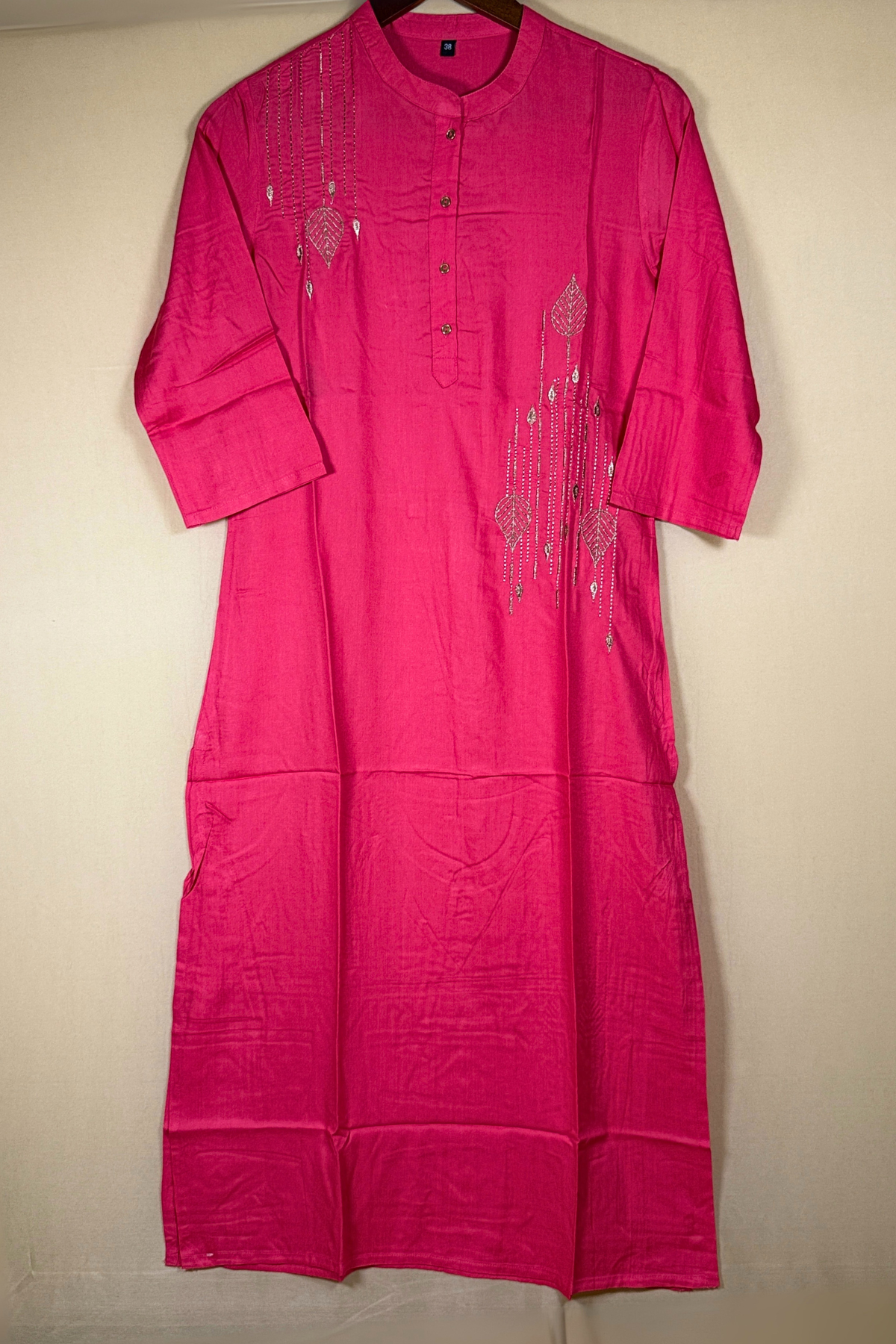 Bold yet refined, the Pink Golden Leaves Cotton Kurti in hot pink is crafted from soft cotton and adorned with intricate golden zari leaf embroidery. The design is elevated with delicate chain-stitch detailing, a mandarin collar, and three-quarter sleeves, making it perfect for festive events, office celebrations, and traditional gatherings.