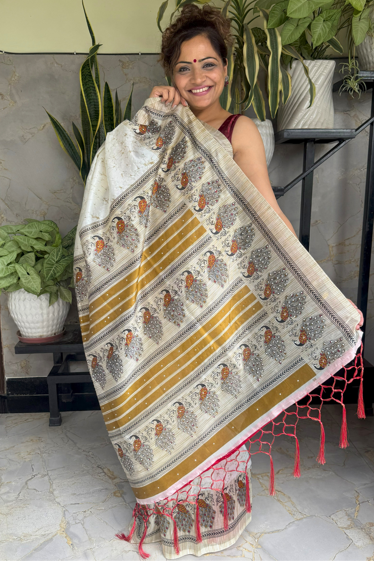 Elegant Cream-Colored saree featuring Intricate Peacock and Floral Motifs with Golden Stripes and Decorative Pink Tassels, crafted from Luxurious Bamboo Silk Fabric.