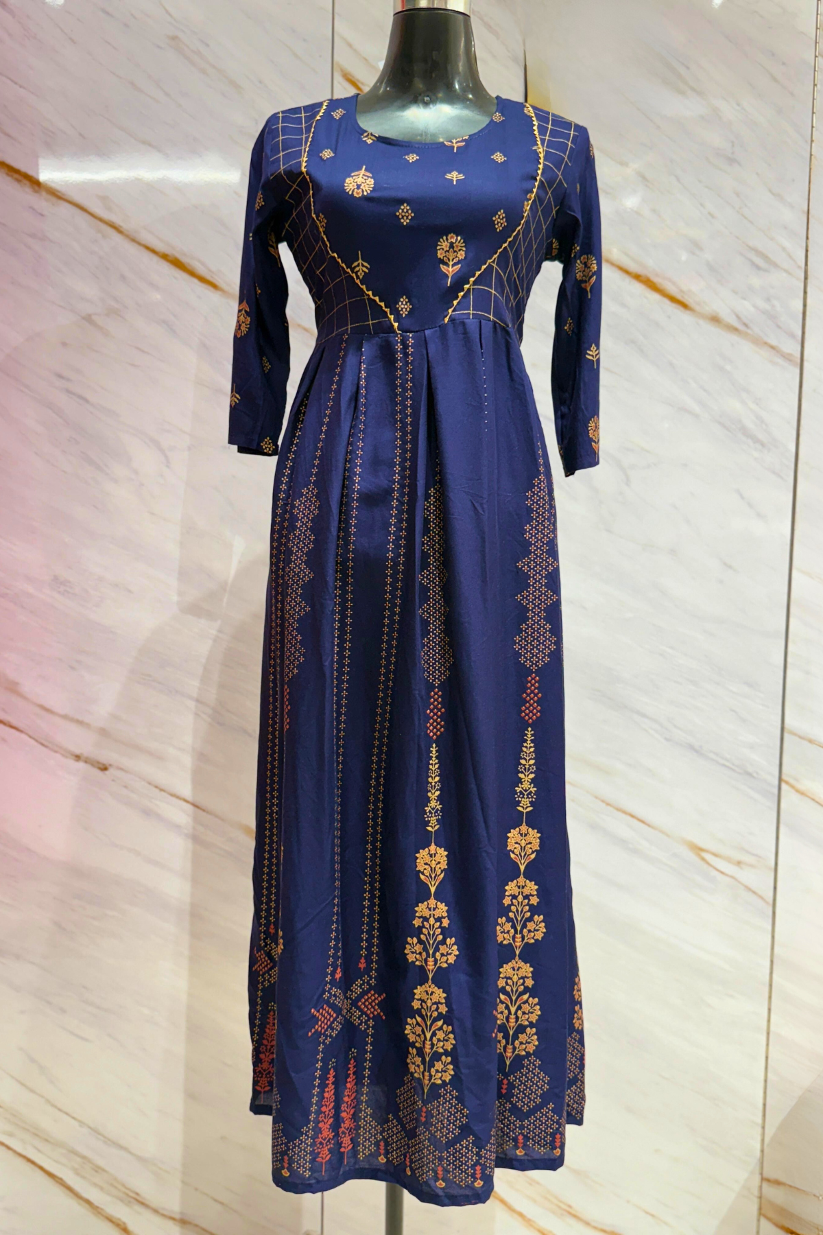 Rich Navy Blue Cotton Kurti featuring Golden Floral Motifs, and Colorful Vertical Embroidery Stripes in an elegant Empire-Waist Silhouette with full-length design.