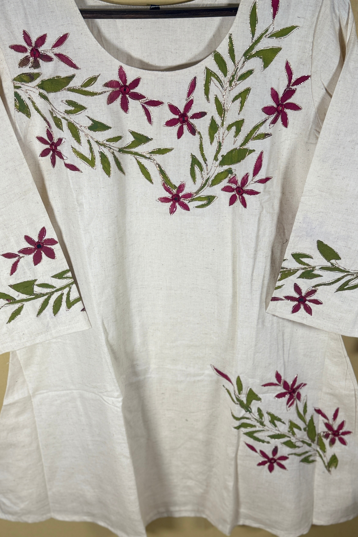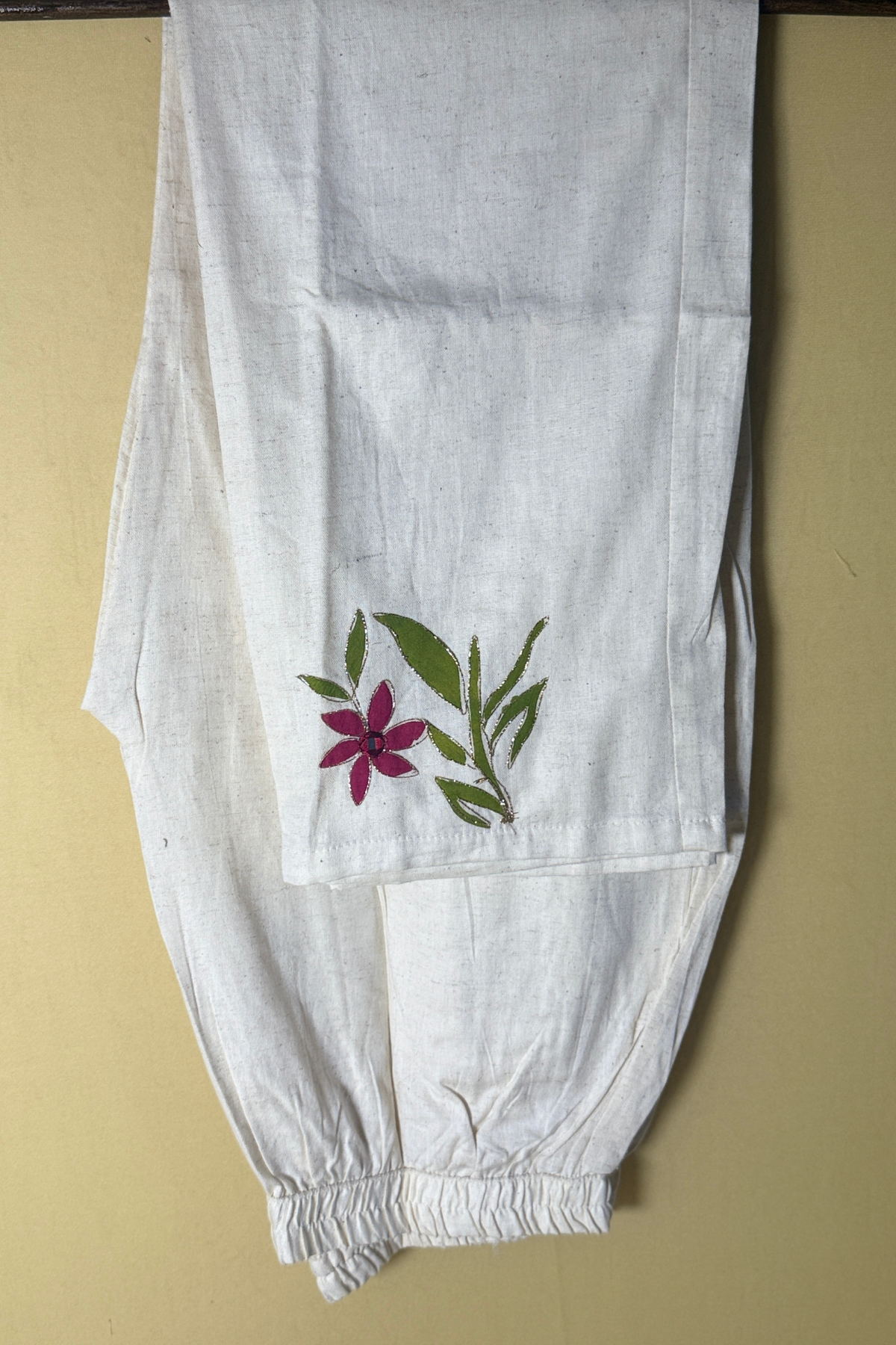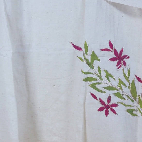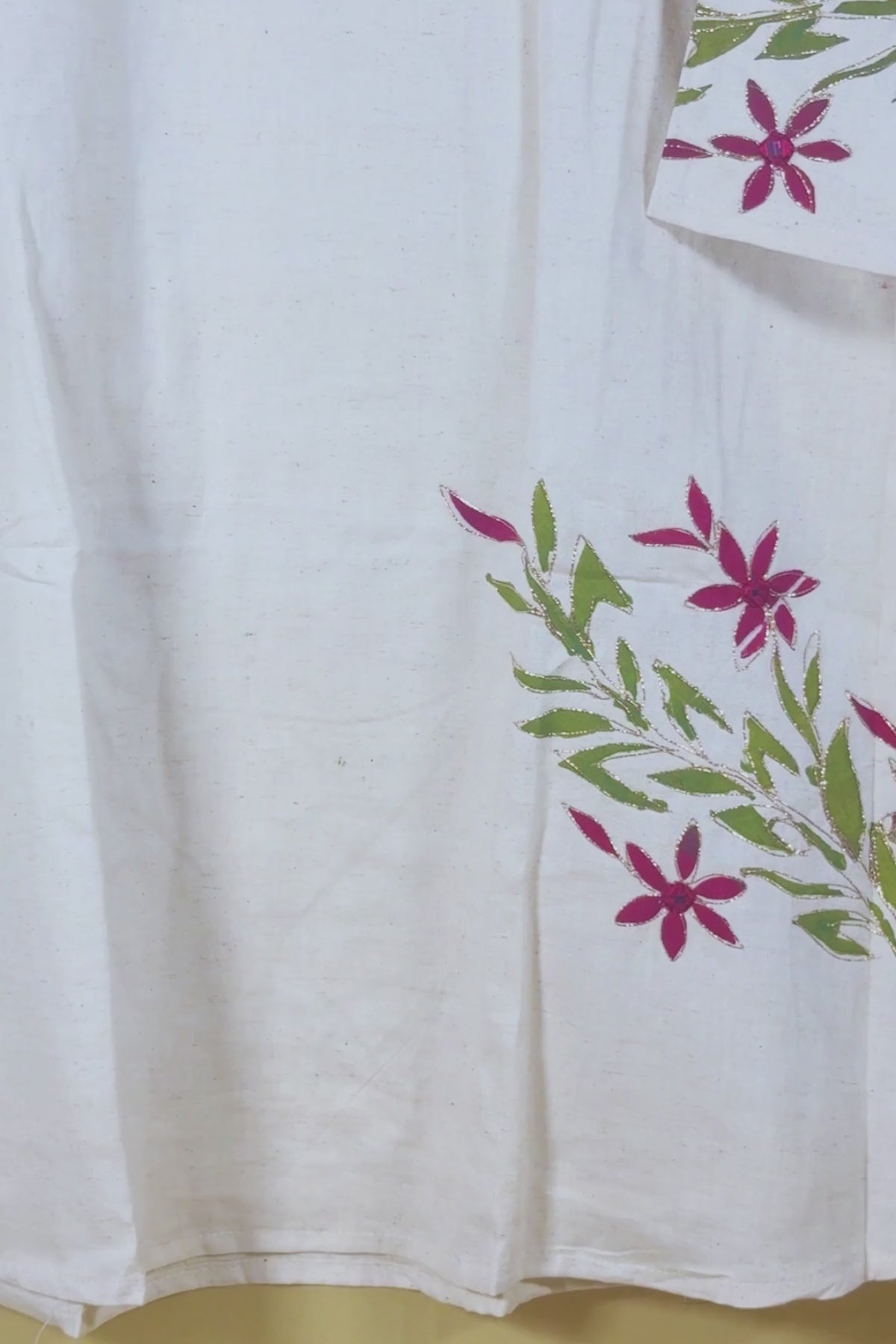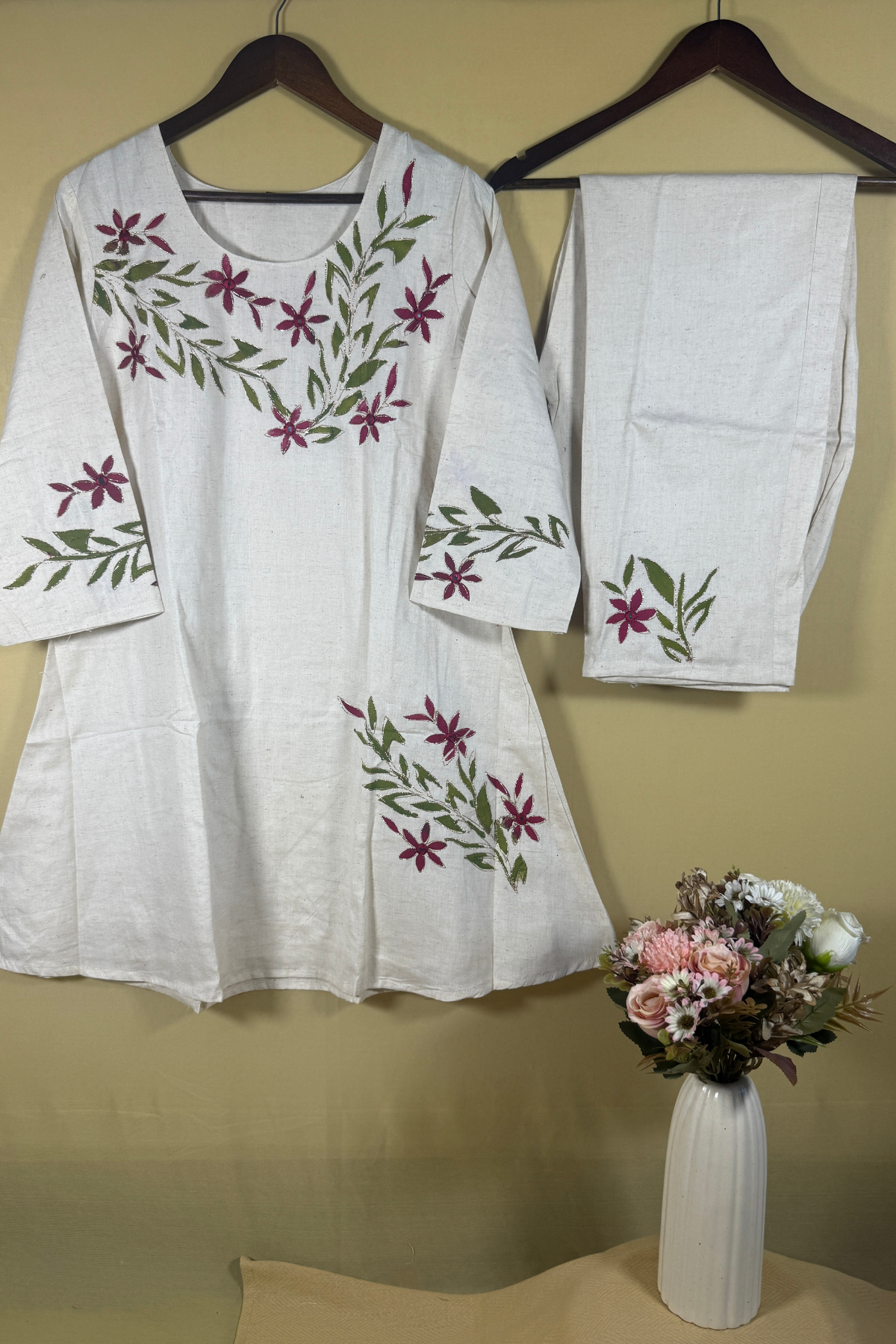 Minimalist White Cotton two-piece featuring Delicate Burgundy and Green Floral Hand-Painted Motifs and Golden Embroidery.