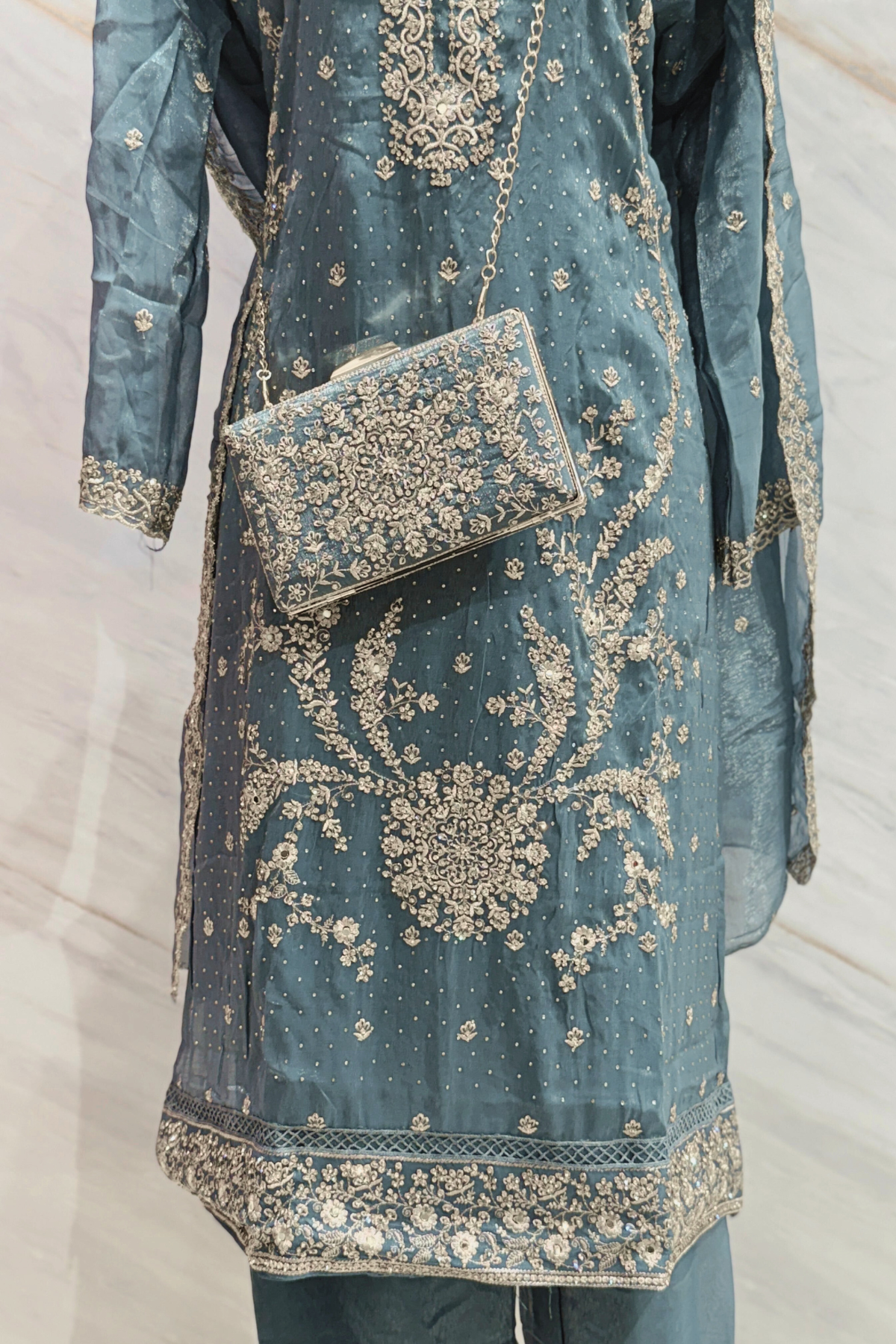 Blue Embelleshed Chiffon Ensemble with Cluch