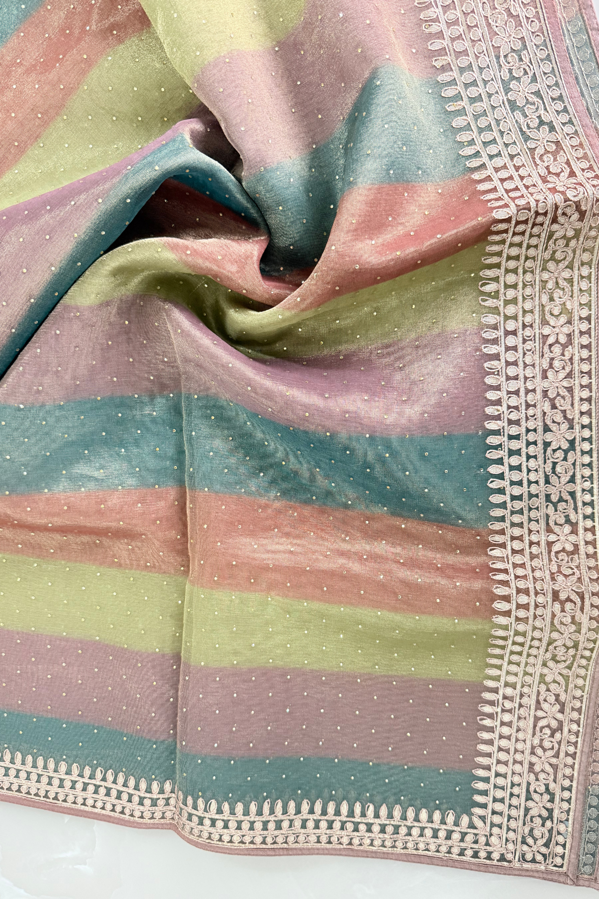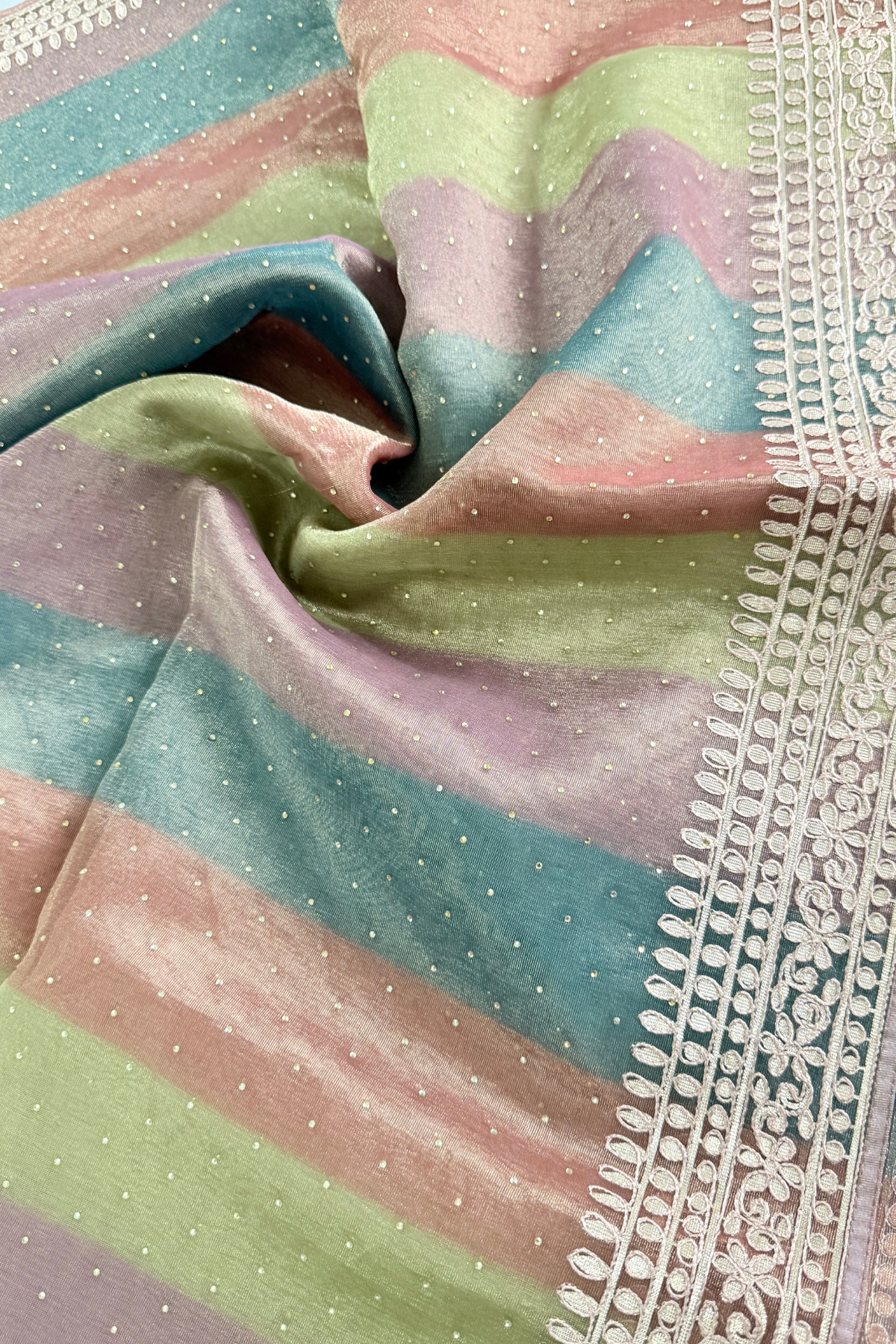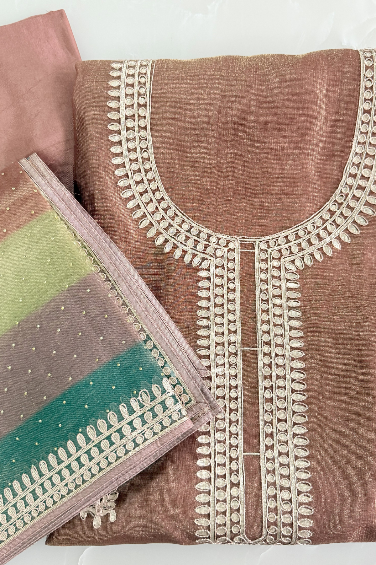 Rich Brown Crush Tissue Kurta featuring Elegant Gold Gota Patti work in traditional Leaf Patterns, paired with a Vibrant Multicolor Dupatta adorned with matching Gota Borders.